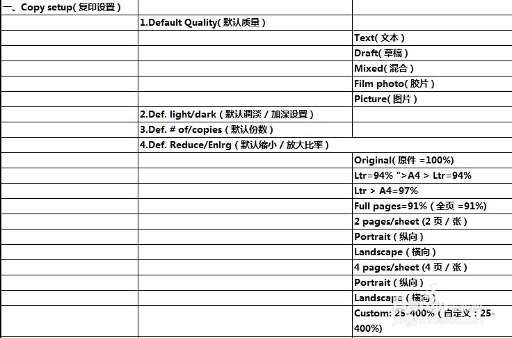 一、Copy setup( 復印設置 ):此項主要調整復印時的質量、份數、縮放比例、復印的深淺。