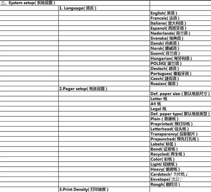 三、System setup( 系統設置 ):主要是設置機器的語言、紙張設置、打印濃度等,此項語言為重點,因為經常有用戶把語言設整成非英文的看不懂導致不能正常使用。