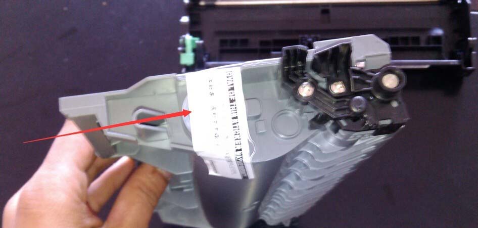 4、拿起其中的硒鼓,如下圖:將箭頭所指的地方封條撕掉,打開蓋子。