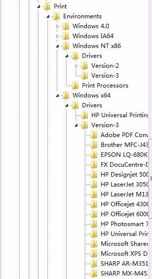 32位找到HKEY_LOCAL_MACHINE/SYSTEM/CurrentControlSet/Control/Print/Environments/Windows NT x86/Drivers/Version-3所有型號打印機的注冊信息。