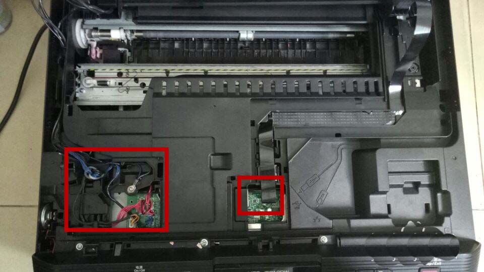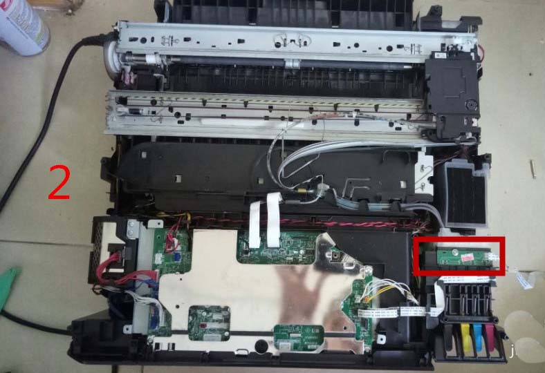 4、分別取下圖示紅圈中的6個螺絲,螺絲取下后就可以將整個上蓋取下。取下后如圖2所示,其中長方形框中就是墨盒傳感器,我們只需將螺絲擰下,再把另一端的排線拔下,進行更換即可?。ūM量按照卡槽的走線方法,這樣比較規整)墨盒傳感器在某寶上有得買,價格二十幾塊錢。