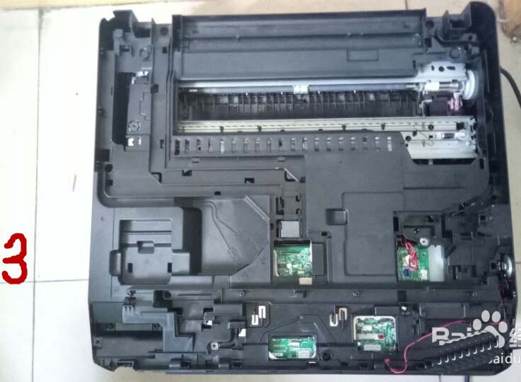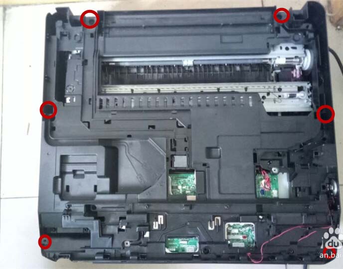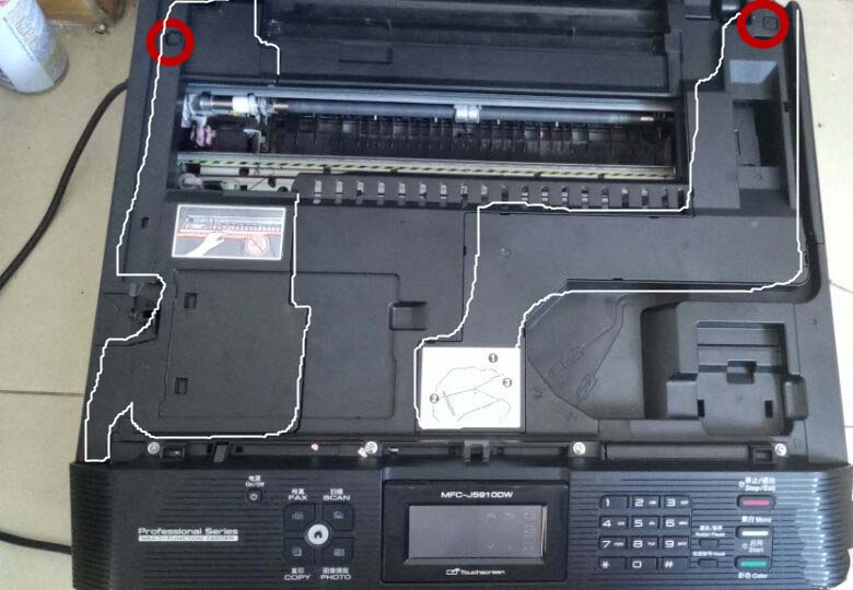 2、從紅色的兩個部位,輕輕的摳起這兩塊蓋板,很容易取下。取下后拔掉紅色框里的全部排線,此舉的目的是卸下掃描器蓋。抬起頂蓋,往后用力頂出去,就可以取下整個頂蓋了。