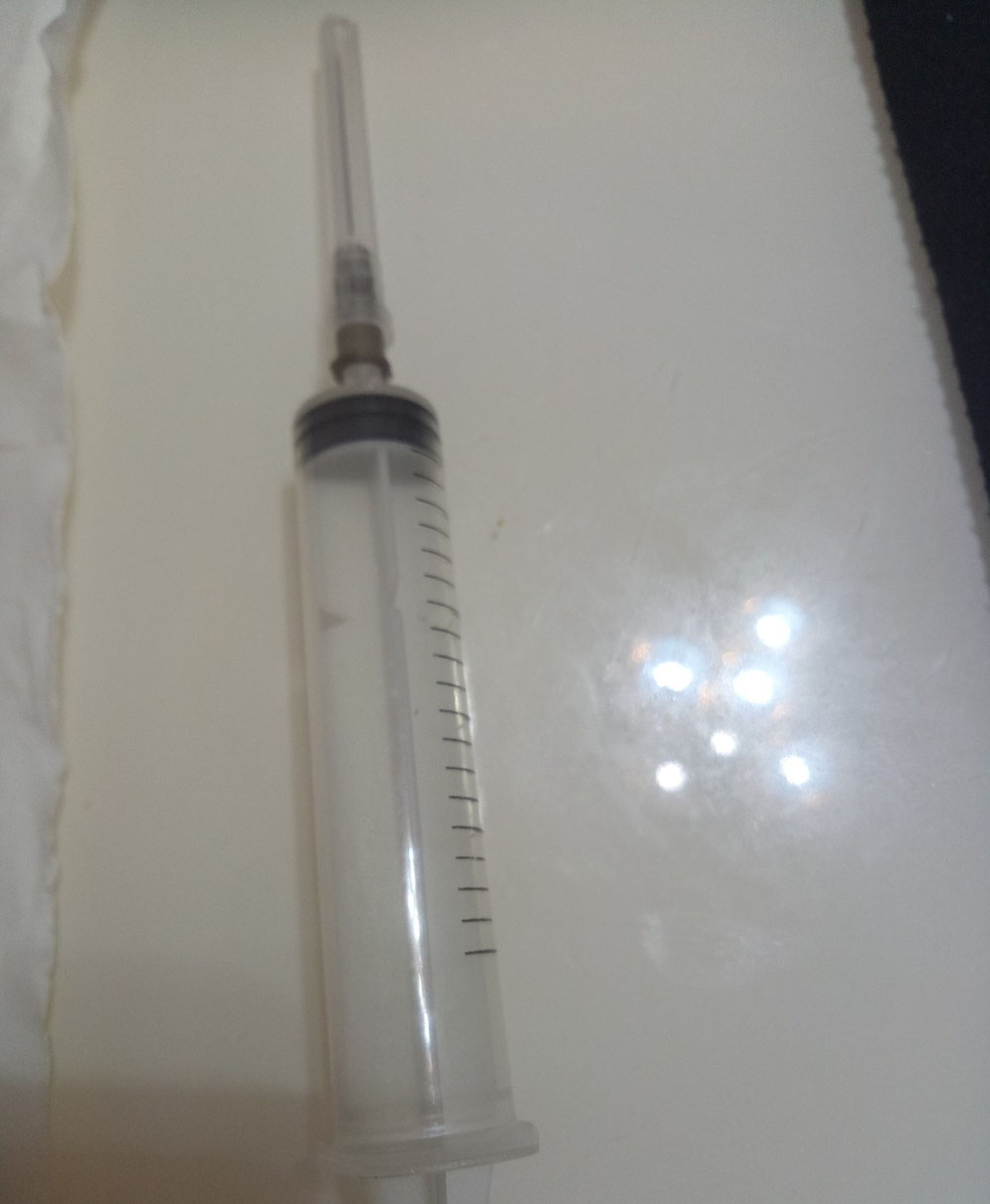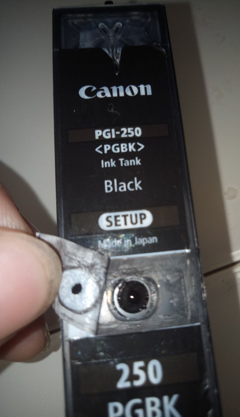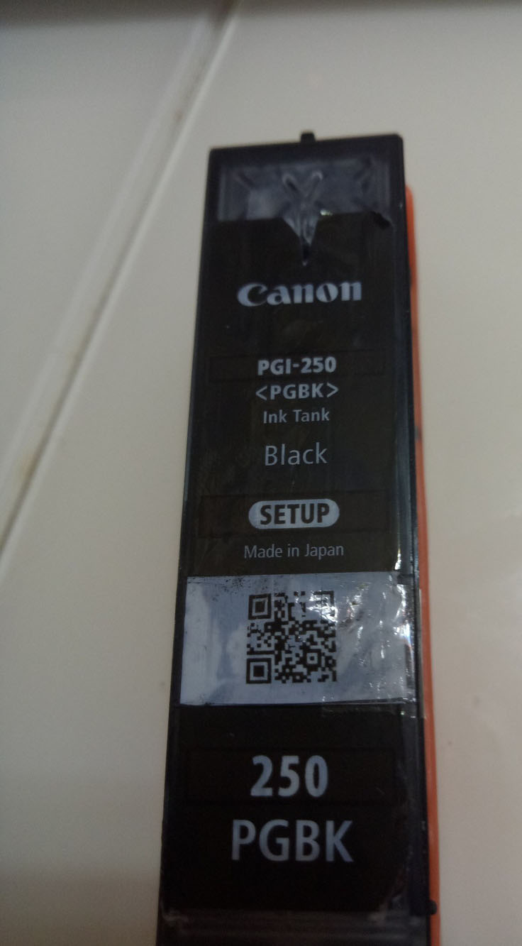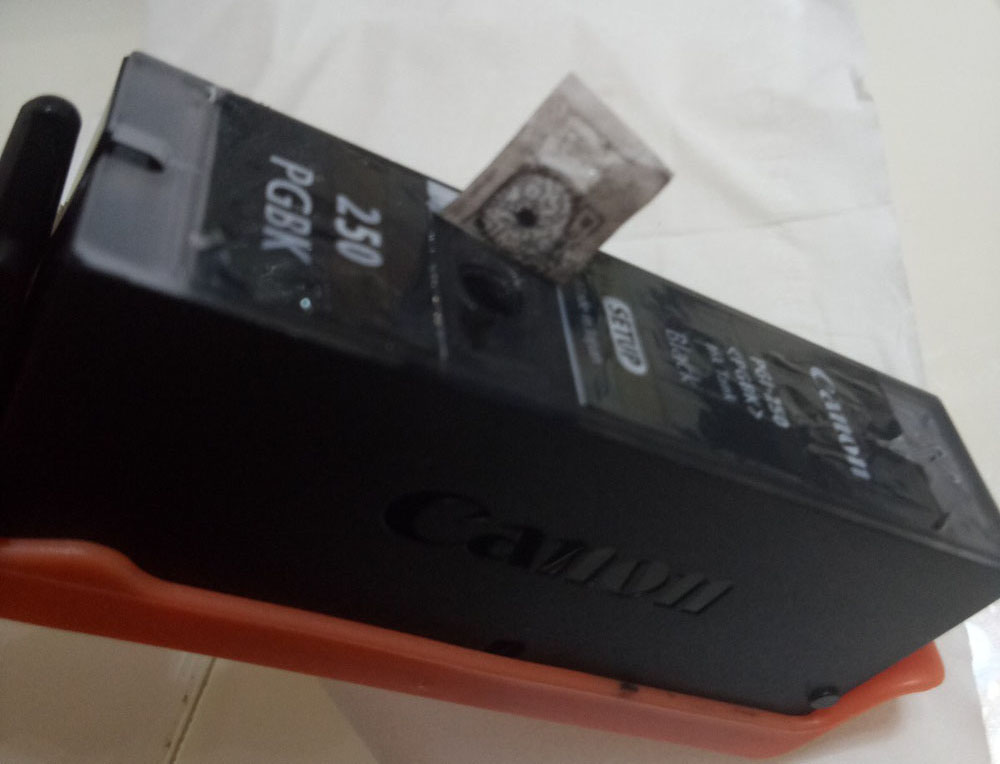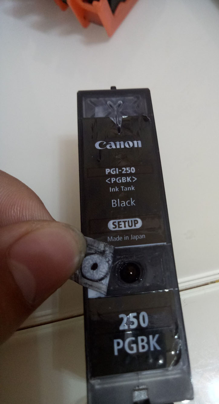 4、然后就可以加墨了,用注射器吸適量的加進去就行了,注意加墨時注射器不要插太深,墨盒要傾斜著便于墨水進入右邊的吸墨海綿區。加完墨后就把圓珠放進孔里,二維碼再貼好,就大功告成了。