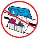 4、滑動新打印頭,讓它稍微向上傾斜,滑入空插槽中,然后輕輕地向上推打印頭,直到它卡合到位。將黑色打印頭插入右側插槽。將三色打印頭插入左側插槽。要合上藍色筆架閂鎖,用力向下按,直至閂鎖卡合到位。(重要提醒: 安裝打印頭后,請勿打開藍色筆架閂鎖,否則會導致嚴重的供墨系統錯誤。)