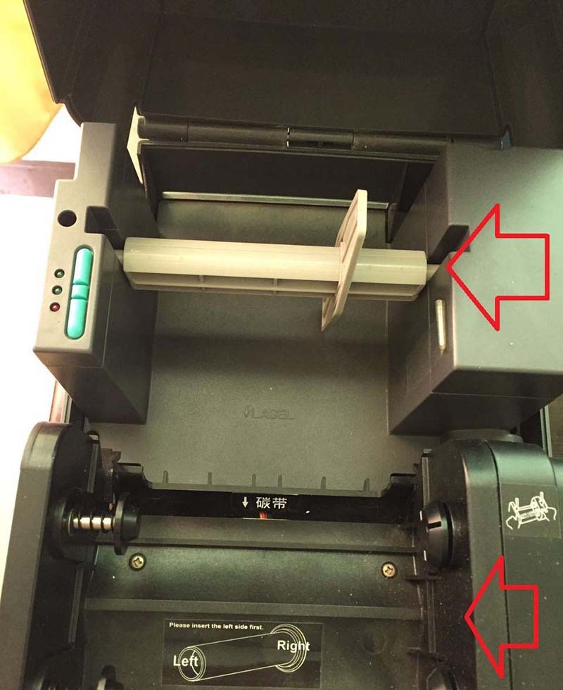 2、打開后觀察機器內(nèi)部。上方箭頭所指位置是安裝熱敏打印紙的位置,下方箭頭所指區(qū)域則是安裝碳帶的位置。這里著重講解熱敏打印紙的安裝