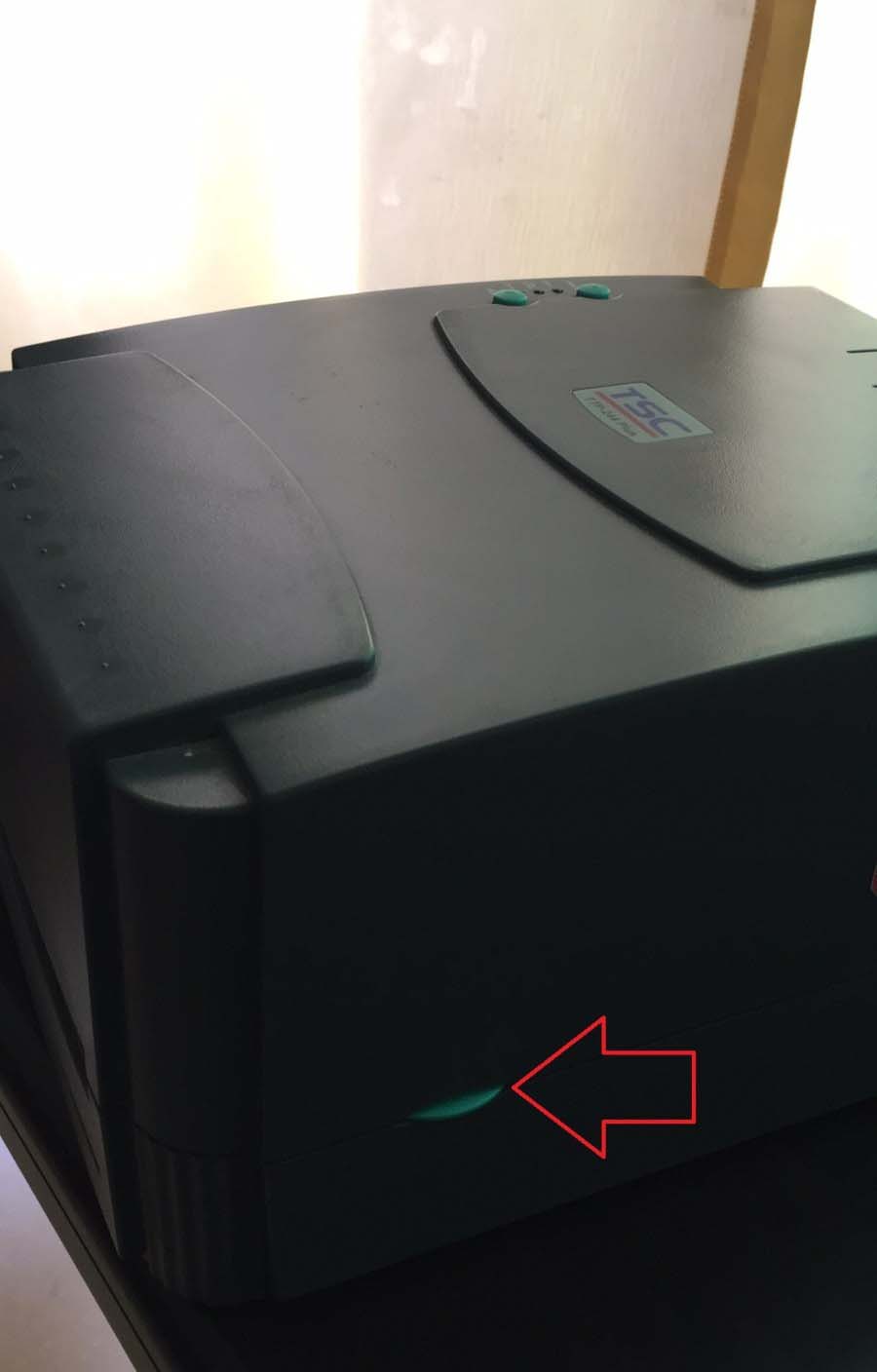 1、首先打開tsc 244plus打印機機蓋。在打印機的兩側(cè)有綠色卡片位打開的開關(guān)。兩手同時按下后可彈開機蓋