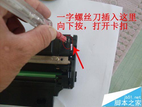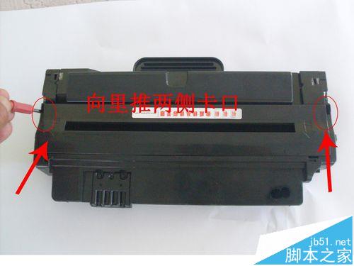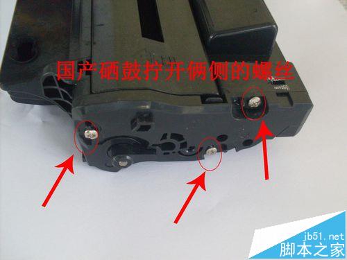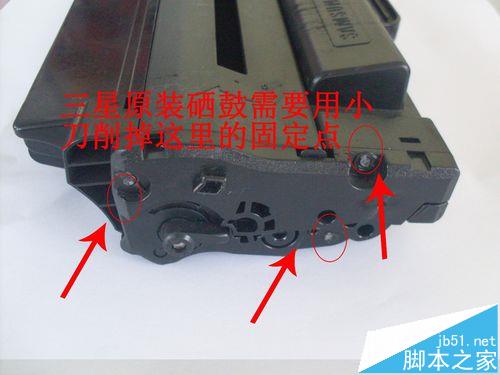 3、三星原裝硒鼓,需用小刀削掉塑料固定點,國產硒鼓是用螺絲固定的,擰掉左右兩側的螺絲就可以了