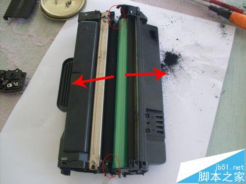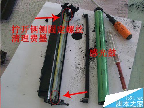 7、清理費墨倉,擰開費墨倉倆側固定螺絲,清理費墨倉內的墨粉,然后將硒鼓安裝好,即可上機測試了,有的機器還需要更換計數芯片,否則會報錯