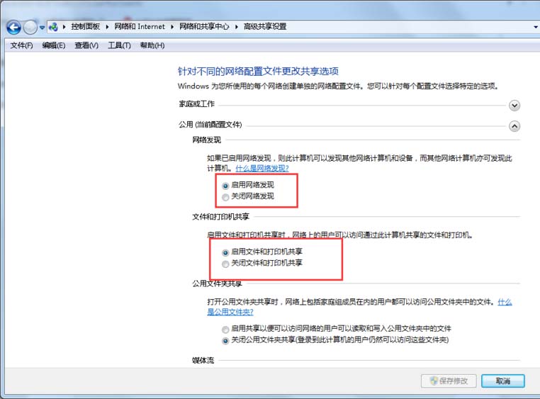 5、在網絡和共享中心面板中找到高級共享設置,點擊進入,然后【啟用網絡發現】和【啟用文件和打印機共享】前面點選。點擊確定,如圖: