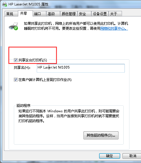 3、在打印機屬性面板中找到共享,把共享這臺打印機點前面對勾點上,如圖: