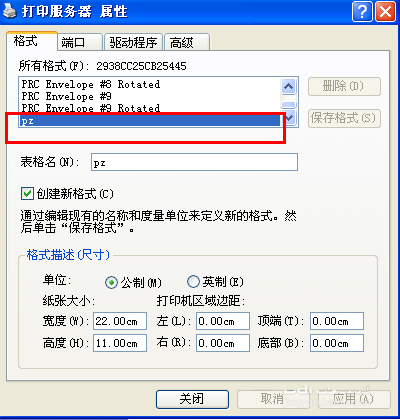 3、在打印機服務器屬性窗口中,選擇“格式”標簽,將“創建新格式”打上勾,然后輸入新格式名稱,在“紙張大小”那里輸入你需要的大小,點擊“保存格式”保存。