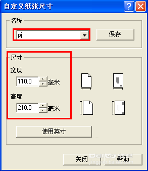 4、在打開的”自定義紙張尺寸“窗口中,輸入紙張名稱,并輸入你需要的紙張大小,最后點擊”保存“按鈕進行保存。