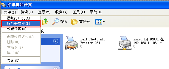 2、點擊“文件”,選擇“服務器屬性”,打開打印機服務器屬性窗口。
