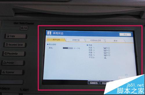 1、在RICOH理光MP5000復印機的面板中點擊系統狀態,此時可以看到維護信息,出現某些故障時這里會有提示,我們找到原因就可以解決故障了。