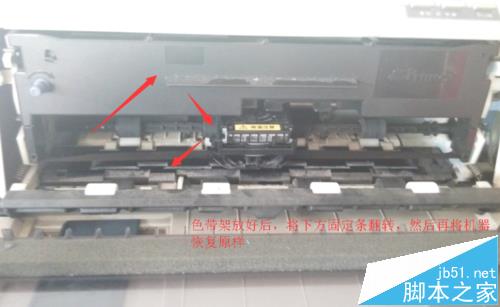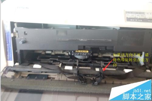 9、將色帶架安裝回去,注意的是下方的色帶安裝方向,如果反了的話將色帶旋轉(zhuǎn)下方向就好了。