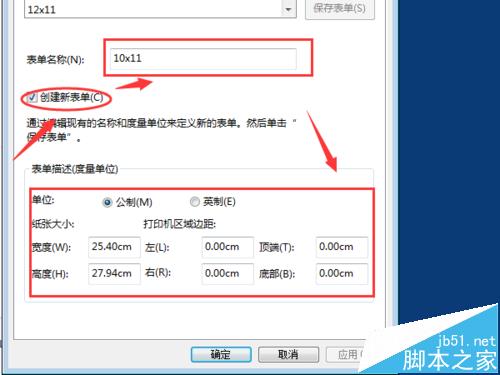 3、勾選“創(chuàng)建新表單”,通過“表單名稱”文本框更改表單名稱,按照紙張實(shí)際尺寸填寫填寫到“表單描述”子窗體中。