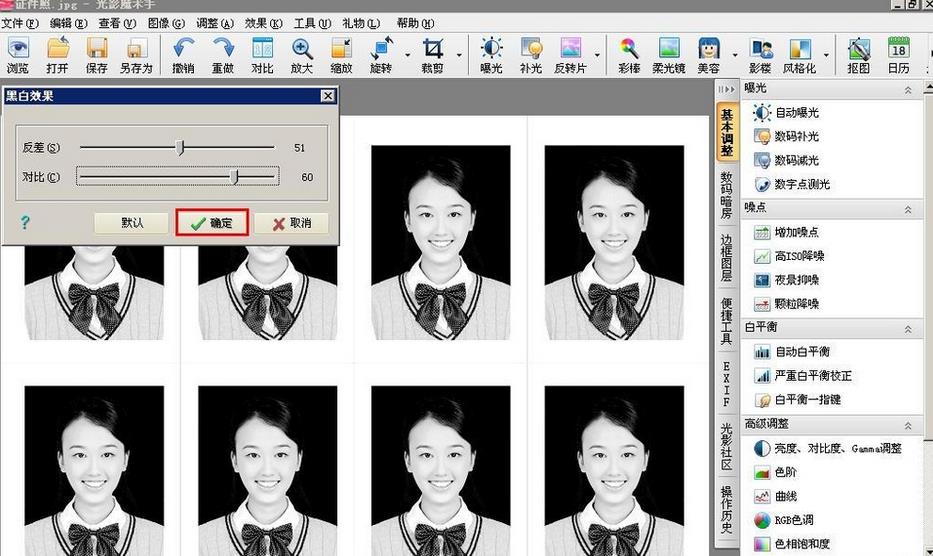 3、這時候彈出的還白效果對話框有兩個設置條可以調整,我們適當調整為我們需要的狀態,可以看到照片已經是黑白的證件版了;