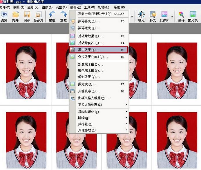 2、排版好之后你會說了,這不是彩色照片排版嗎,不著急,下面我們點擊效果——黑白效果選項,進入效果設置界面;