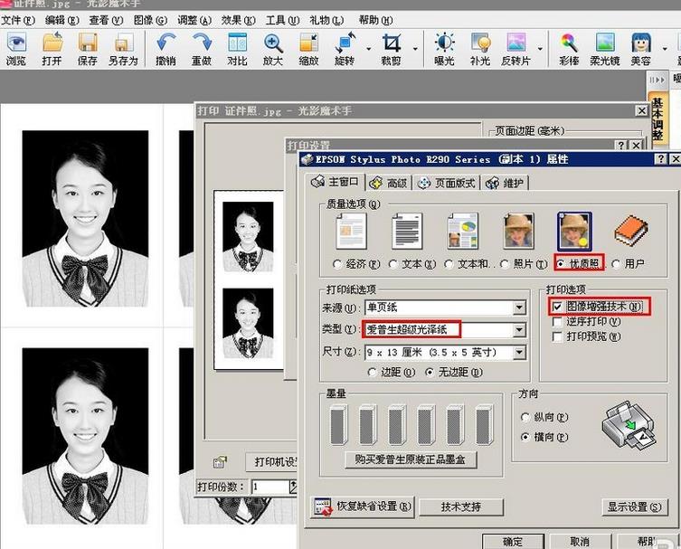 5、在彈出的打印設置界面,我們點擊打印機設置,進入愛普生R290的設置界面,我們選擇優質照片——愛普生超級光澤紙——圖像增強技術——然后我們點擊上面的高級進入到高級設置界面;