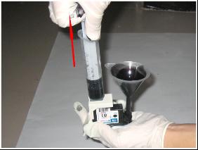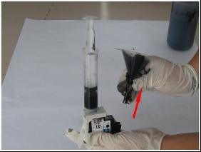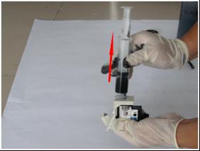 11、當漏斗中的墨水剩余不多時,放松注射器,然后靜置約半分鐘,以使打印頭內部壓力平衡。不可以將漏斗中的墨水全部吸入打印頭內,否者會有空氣進入打印頭中。
