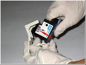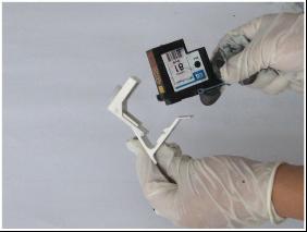 3、將需要修復的打印頭沿箭頭所指方向伸入吸墨槍中。