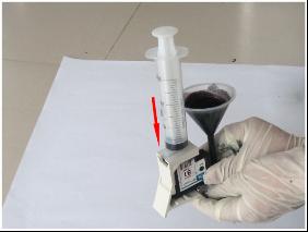 10、用手稍用力將注射器往上提。看著漏斗中的墨水慢慢進入打印頭,打印頭中的墨水與空氣慢慢進入注射器中。