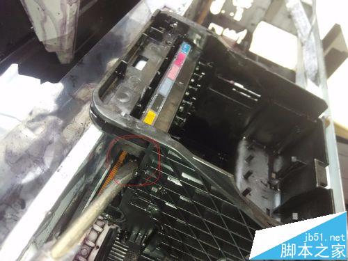 1、墨盒接觸板的后面有卡扣,改刀所指的位置,將卡扣按進去后,墨盒接觸板才能取下,最后噴頭就好取了。。。