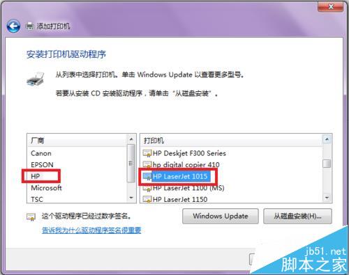 13、由于hp LaserJet 1010不支持win7(同時這個版本也沒有顯示出來),所以在此我們選擇“hp LaserJet 1015”,如紅色框標(biāo)記所示,然后點(diǎn)擊“下一步”。