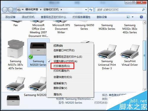 3) 右鍵點擊【Samsung M2020 Series】的打印機圖標,選擇【打印首選項】。