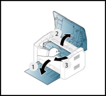 1、打開前蓋,再打開頂蓋,然后取出墨粉盒。