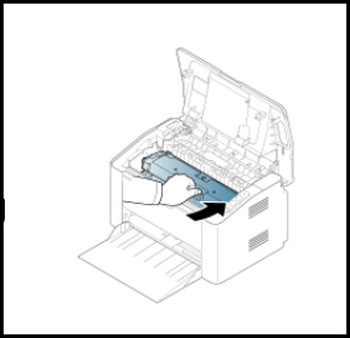 3、握住墨粉盒把手,慢慢將墨粉盒插入打印機的開口處,然后推回粉盒倉。