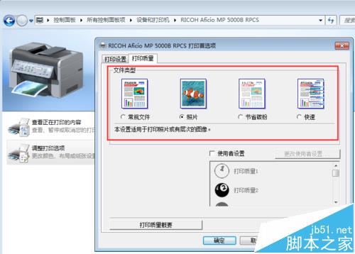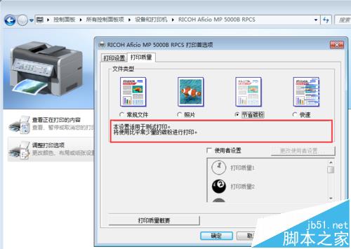 在RICOH理光MP5000的打印質量設置中我們可以設置文件類型,比如常規文件、照片、節省碳粉以及快速等等。有時打印文件并不需要太高的打印質量,這時我們就可以設置為節省碳粉、快速等模式,選擇其中一個模式以后下方可以看到簡要的說明,通過這個選項我們可以大大的節省碳粉,減少開支。