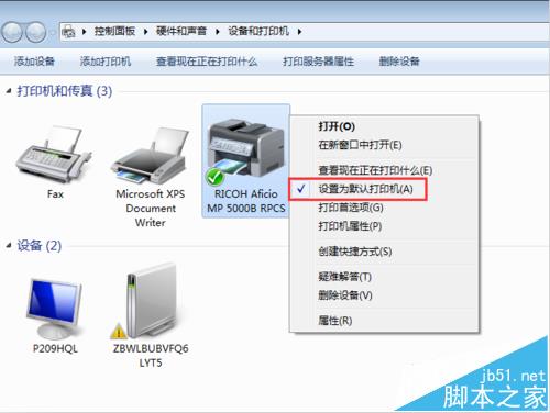 使用RICOH理光MP5000需要先將其設置為默認打印機,這樣可以避免我們每次打印的時候都需要選擇打印機的麻煩。首先我們點擊電腦的開始菜單,選擇設備和打印機,然后右鍵單擊RICOH理光MP5000打印機,勾選設置為默認打印機。