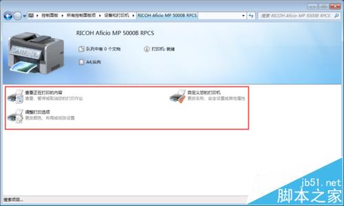 在設備和打印機中雙擊RICOH理光MP5000之后進入設置,在這里我們可以點擊查看正在打印的內容,自定義自己的打印機為其改名等等,最主要的是我們可以點擊調整打印選項。