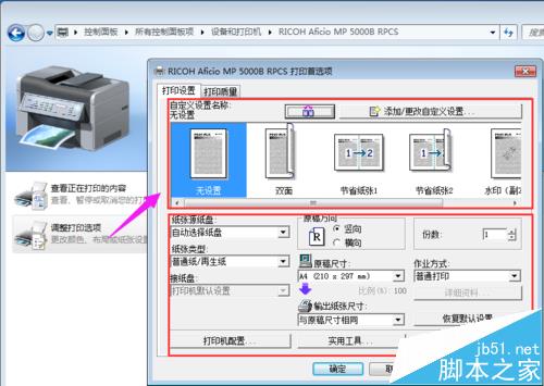 RICOH理光MP5000的打印選項設置中我們可以詳細的設置打印的各個選項,比如上面可以設置雙面打印、節省紙張等等模式;在下面可以設置紙張源紙盤、紙張類型、原稿的方向、原稿尺寸、輸出紙張的尺寸以及作業方式等等。