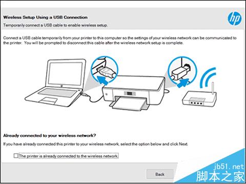 (2)使用 USB 連接執行無線設置: 網絡檢查無法收集網絡設置。 使用 USB 連接線將電腦和打印機相連,然后點擊 “下一步”。 采用 USB 連接僅是臨時方法,安裝程序將提示您在設置完成后拔下 USB 連接線。