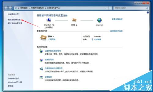 6、選擇【打開網(wǎng)絡(luò)和共享中心】左上角的【更改適配器設(shè)置】,如下所示