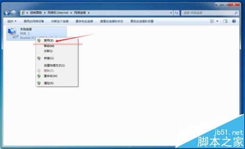 7、右擊彈出對話框中的【本地連接】,選擇彈出的對話框中的【禁用】,禁用網(wǎng)卡,如下所示
