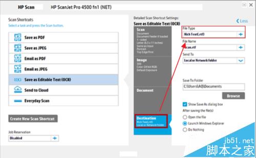 2、打開HP掃描。在掃描快捷方式中,選擇“保存到可編輯的文本文檔(OCR)”,然后在掃描快捷方式設置的右上角點擊“更多設置”選項卡以修改相應設置