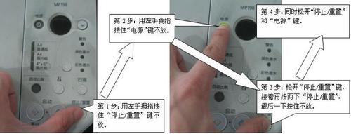 用左手拇指按住“停止/重置”鍵不放,再用左手食指按住“電源”鍵,然后松開“停止/重置”鍵(注意不能松開“電源”鍵哦),接著按兩下“停止/重置”鍵。最后,同時松開“停止/重置”鍵和“電源”鍵。此時,打印機電源指示燈開始閃爍,約10秒后自動進入維修模式,數顯顯示0。