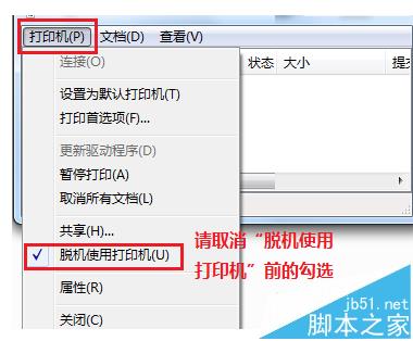 3、再次單擊“脫機(jī)”選項(xiàng),取消“脫機(jī)”前面的“√”。測試頁成功被打出,問題解決~~~