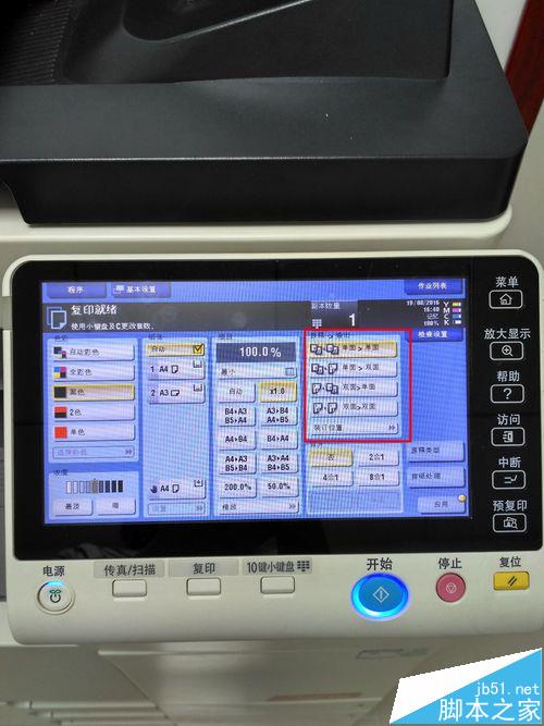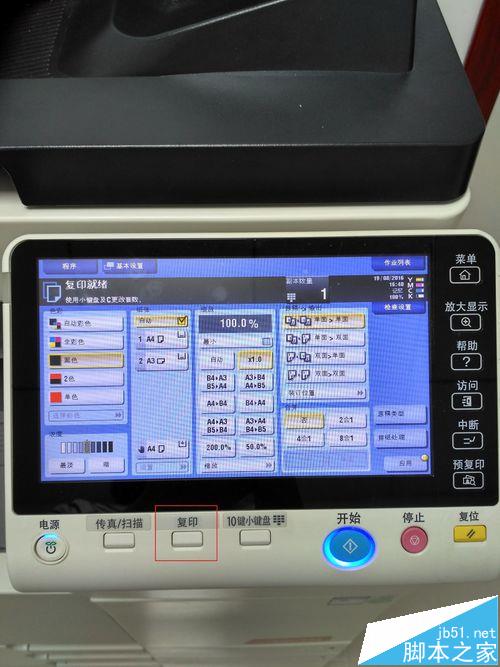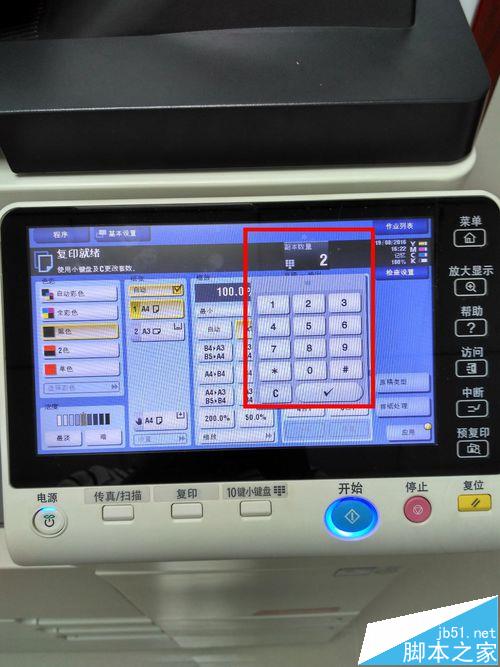 2、打印機啟動后,點擊復印按鈕,將文件放到送稿器位置。在屏幕,副本數量點擊,在彈出的小鍵盤上選出要復印的數量,點擊對號。