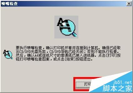 6、在彈出的下圖所示的界面后,點(diǎn)擊開(kāi)始打印按鈕,打印噴嘴測(cè)試圖案,準(zhǔn)備好一張A4的紙張放好在打印機(jī)里;