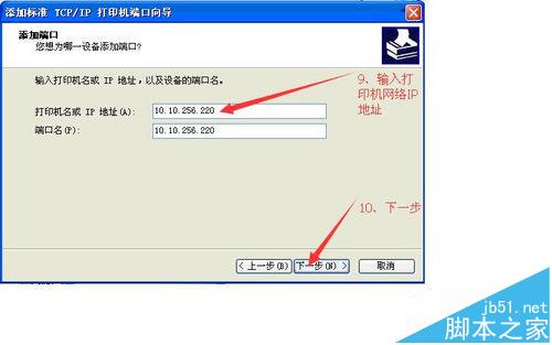 5、接下來就是關鍵的一步了,填入正確的網絡打印機的IP地址,單擊“下一步”按鈕,最后一步確認對話框中單擊“完成”按鈕: