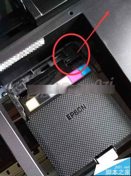 6、輕輕用力往里,推動墨倉蓋子的卡扣,然后往上翻蓋子