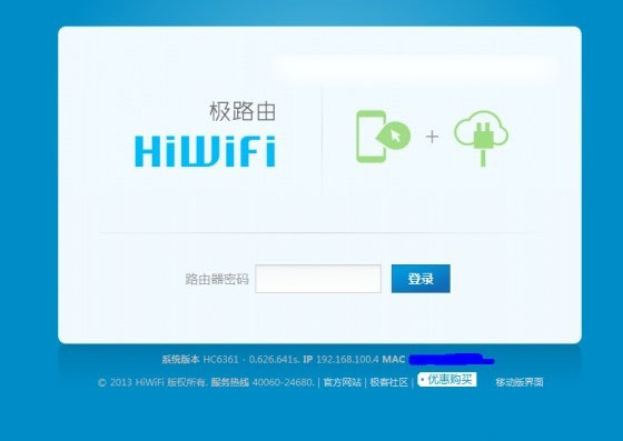 2、之后我們只要輸入密碼即可,這個默認密碼在極路由器說明書以及極路由器表面上的銘牌上會有標注,初次使用后,建議大家修改密碼。進入極路由(HiWiFi )初始管理界面如下圖: