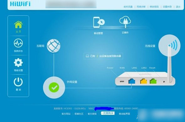 如上圖,可以看到極路由HiWiFi 設置界面與普通無線路由器界面有很大的不同。這種友善的設計界面在登錄后更加顯現(xiàn),對比一般路由路由器設置界面,極路由的圖形化界面讓人眼前一亮,簡單明了的設置界面,更容易讓小白朋友也輕松上手。
