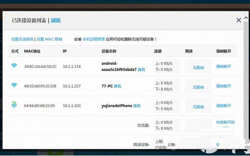 此外,極路由3后臺可以非常方便的查看目前已經連接路由器的上網設置,并且可以控制連接設備網速和強制斷開連接,可以很好的防止被蹭網,如下圖所示。