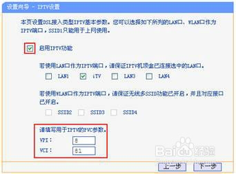 接下來是IPTV設置,如果您同時在電話線路上開通了IPTV業務,請勾選"啟用IPTV功能",勾選啟用IPTV功能后,選擇一個iTV口來連接您的機頂盒(默認為第二個LAN口)。同時輸入當地用于收看IPTV的PVC參數,若不清楚請向運營商咨詢。