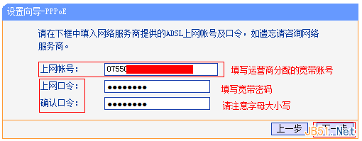 4、填寫寬帶帳號和密碼:“上網帳號”填寫:寬帶帳號——>“上網口令”和“確認口令”填寫:寬帶密碼——>點擊“下一步”。